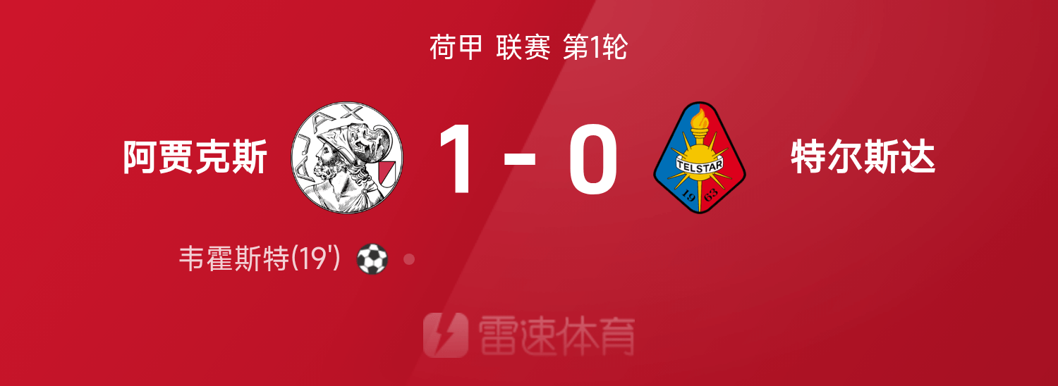 08月10日讯 25/26赛季荷甲联赛第1轮,阿贾克斯对阵特尔斯达。半场比赛结束,凭借韦霍斯特的破门建功,阿贾克斯1-0领先特尔斯达。