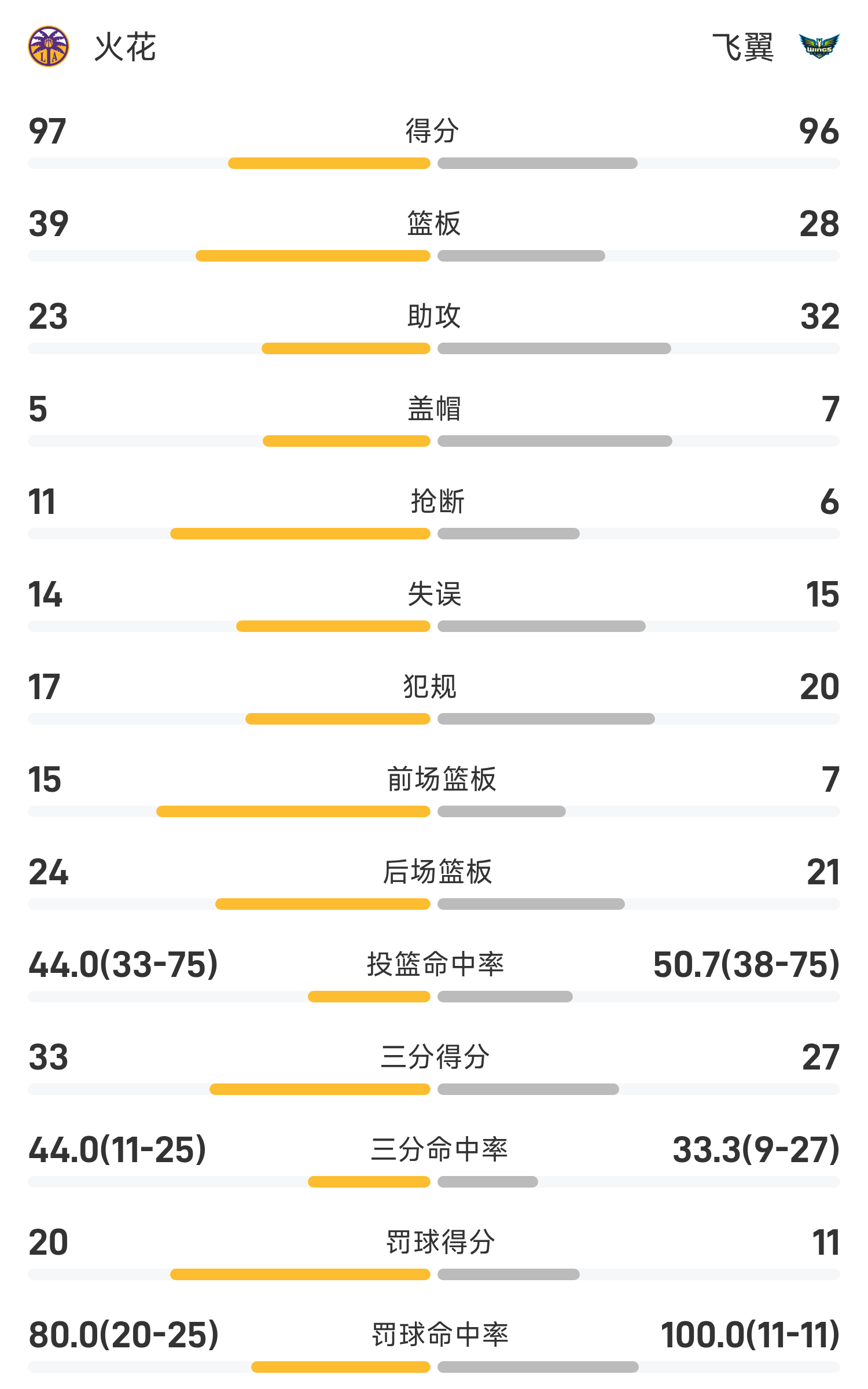 双方全场战罢,飞翼96-97不敌火花。